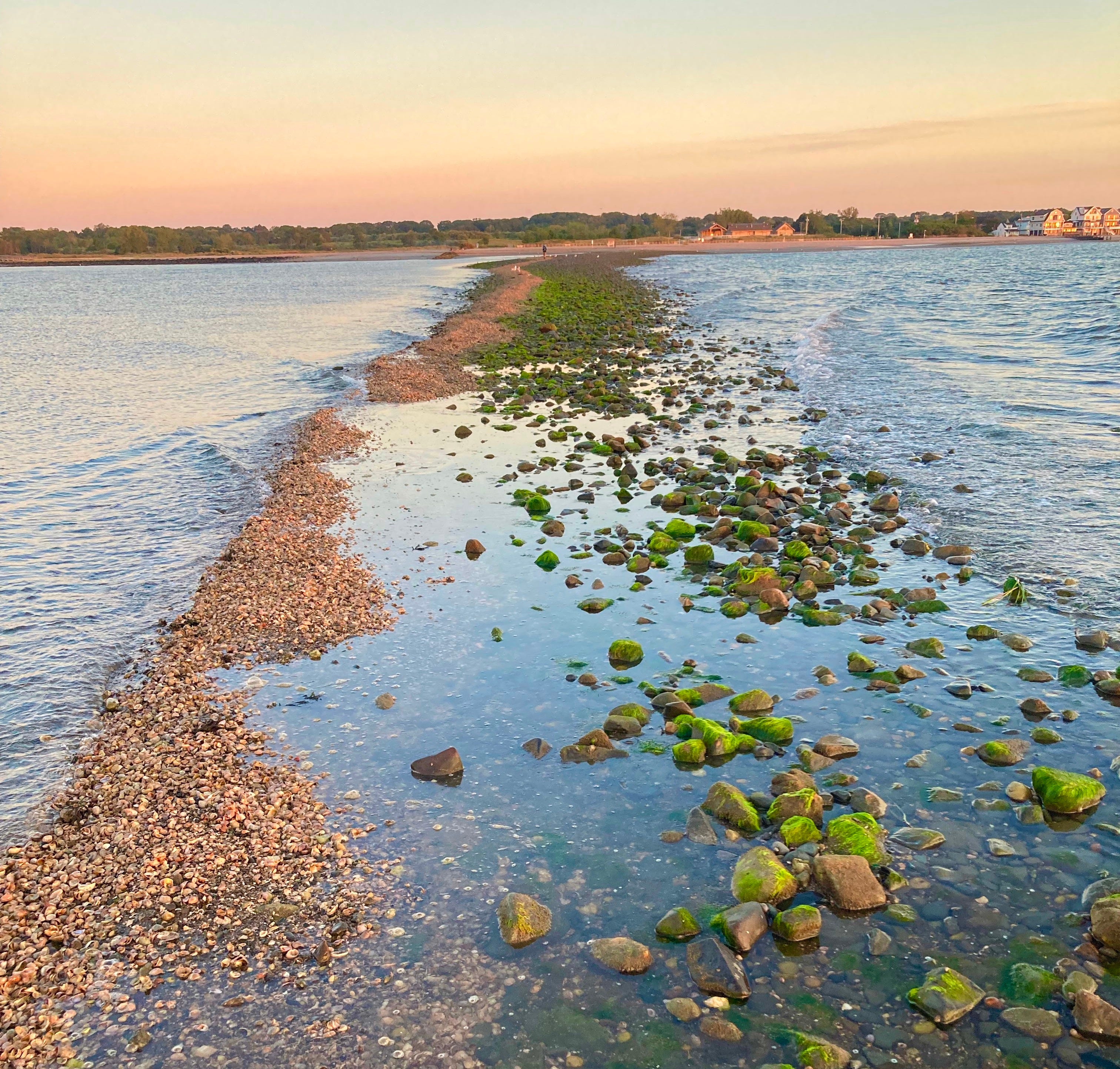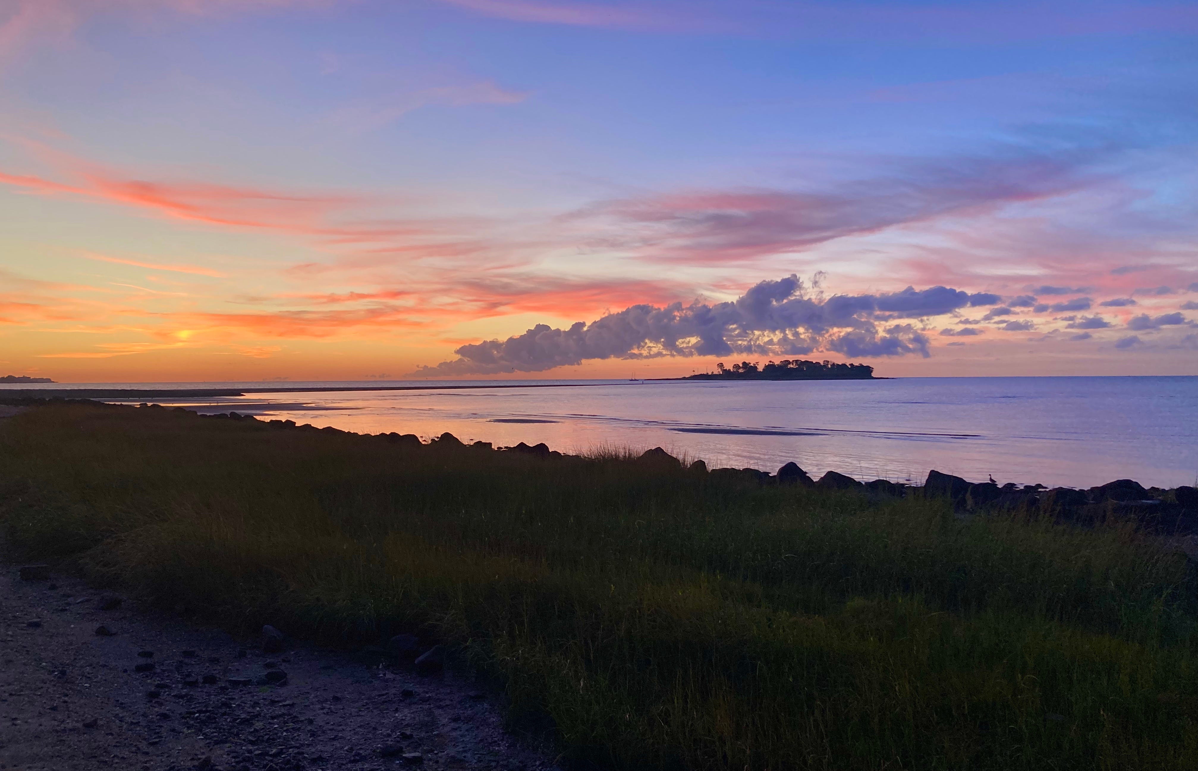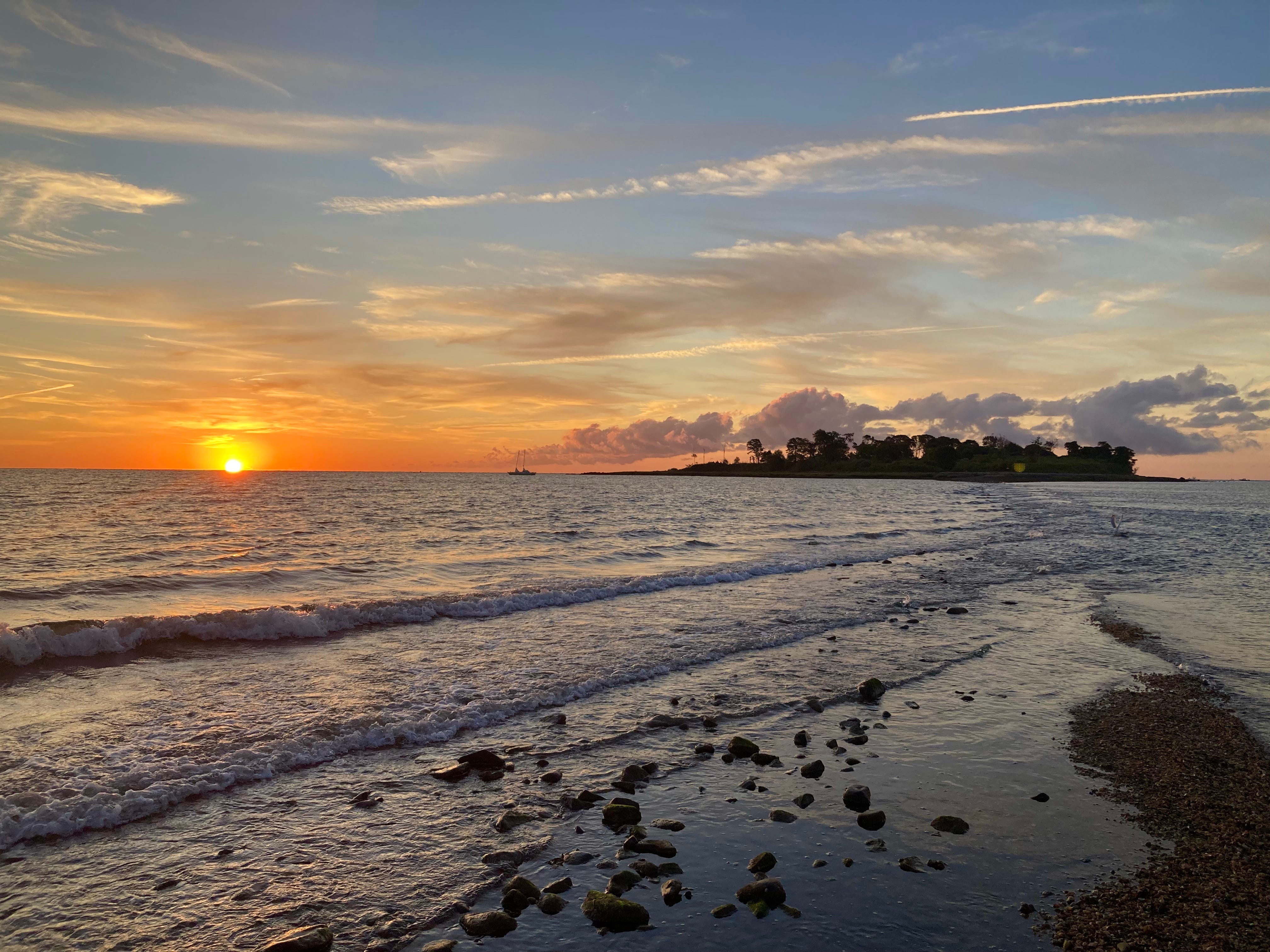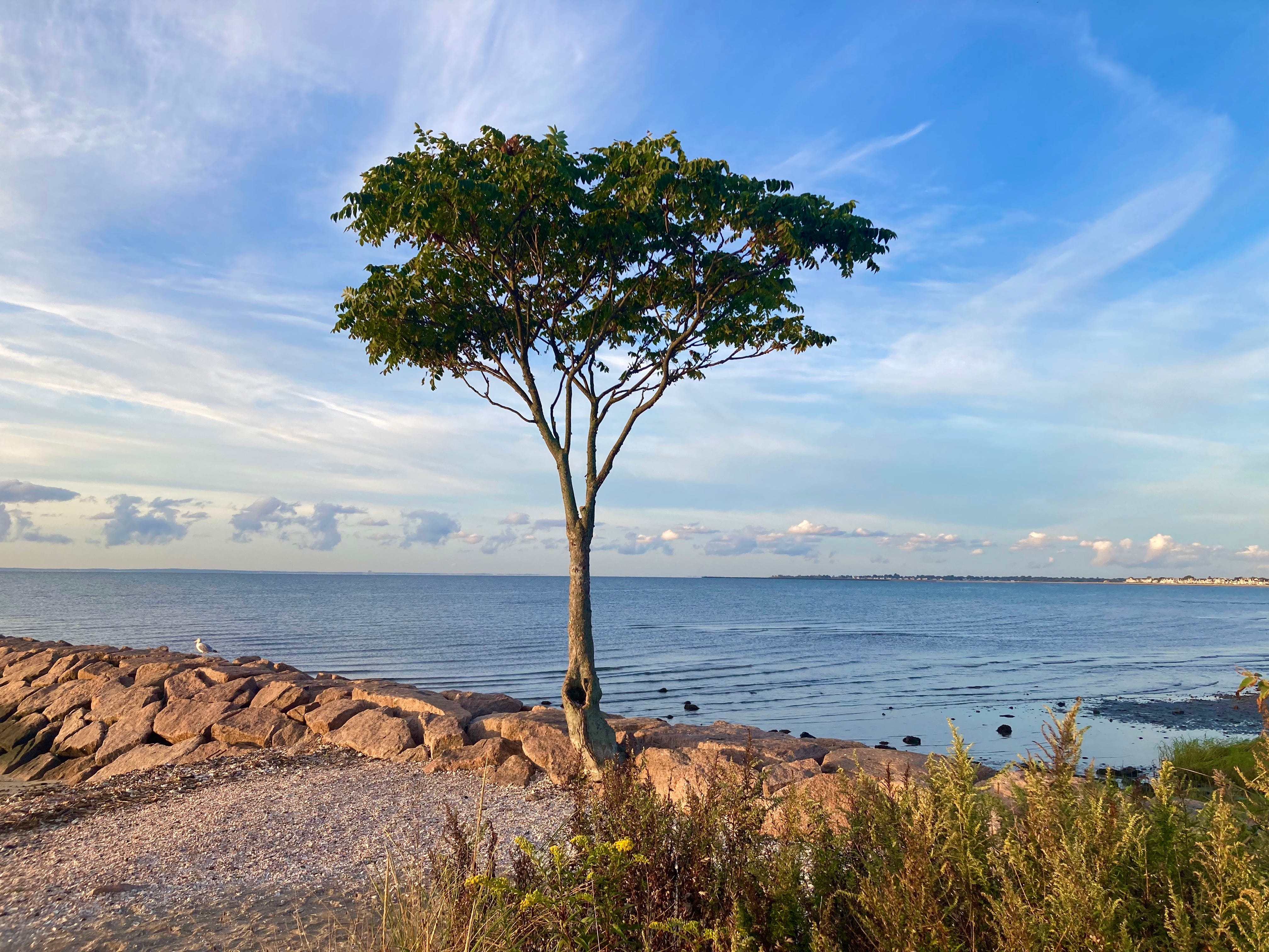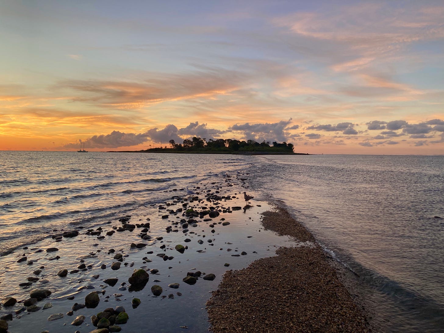 On the last full day of summer, I arrive on the beach in Milford, Connecticut not long before sunrise, about an hour into a flood tide that’s still low enough to keep the gulls busy feeding. The sand bar leading out to Charles Island, a half mile offshore, is covered over at the far end, but I walk on the sandy, shell-strewn surface as far as I can go, checking behind me often. Across the top of the island and farther out over the water, a gang of low hanging clouds is lined up and pointing toward dawn. High, feathery cirrus clouds streak the sky south and east. It’s chilly with a light wind, and I’m wearing long hiking pants and a hoodie for the first time all summer. The early-morning autumn cool has been with us around here for some time now, and I’ve finally relented.