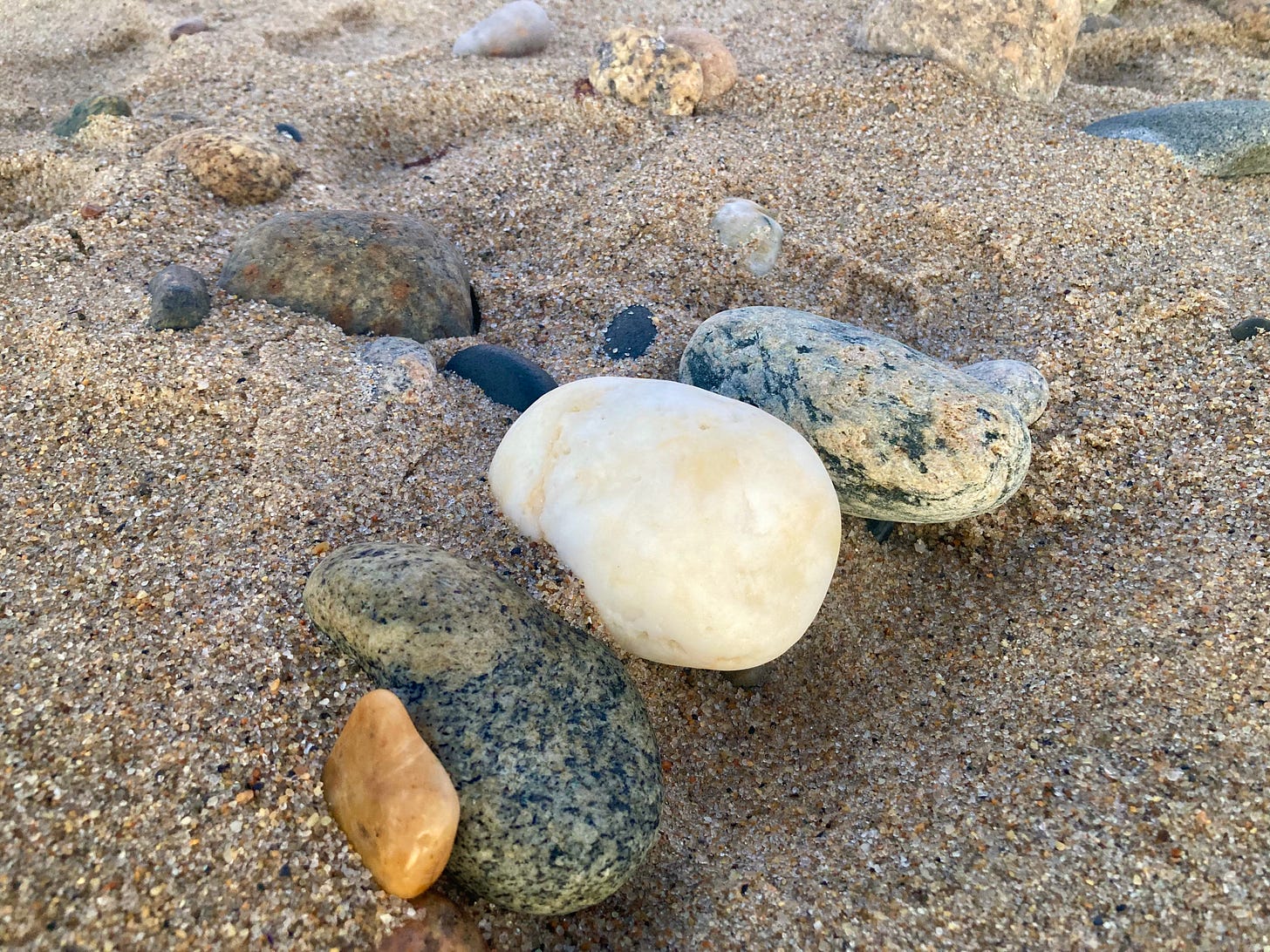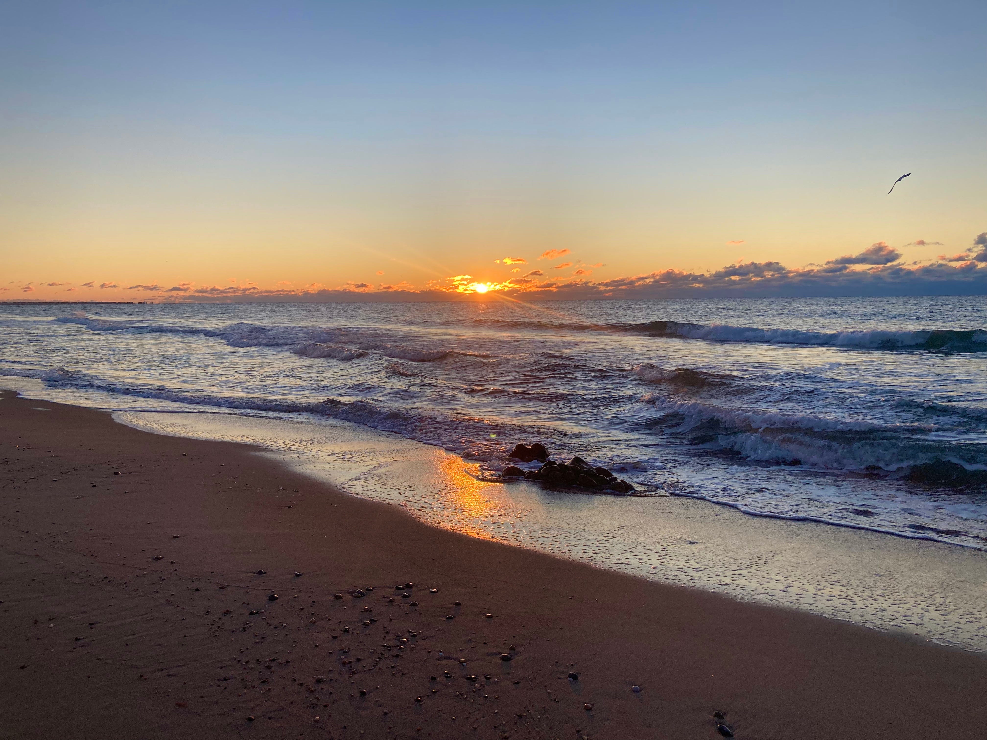 It’s clear, cold and breezy as I arrive, most certainly a winter shore this morning. An ebbing tide has allowed me a wide beach, and the path I choose for my stroll is just to the ocean side of the band of moonstones that parallels the shoreline. Moonstones come in a variety of sizes and colors but are all basically oval shaped. My favorites are the smaller white ones, delicate and nearly translucent, with a fragile appearance that suggests they could dissolve if held for too long. Seaward and distant, a clot of loaded, low-flying cumulous clouds are ruling the horizon from east to south, but I welcome these and their potential to be backlit and gold fringed when the sun does rise. There are some gentle swells rolling in off the open Atlantic from the southwest, lifting up just offshore before collapsing onto the beach. I walk westward toward Green Hill Point, checking the sky behind me often. The clouds do not disappoint — a brilliant yellow glow traces their upper edges for some long moments before the sun finally breaks over them.