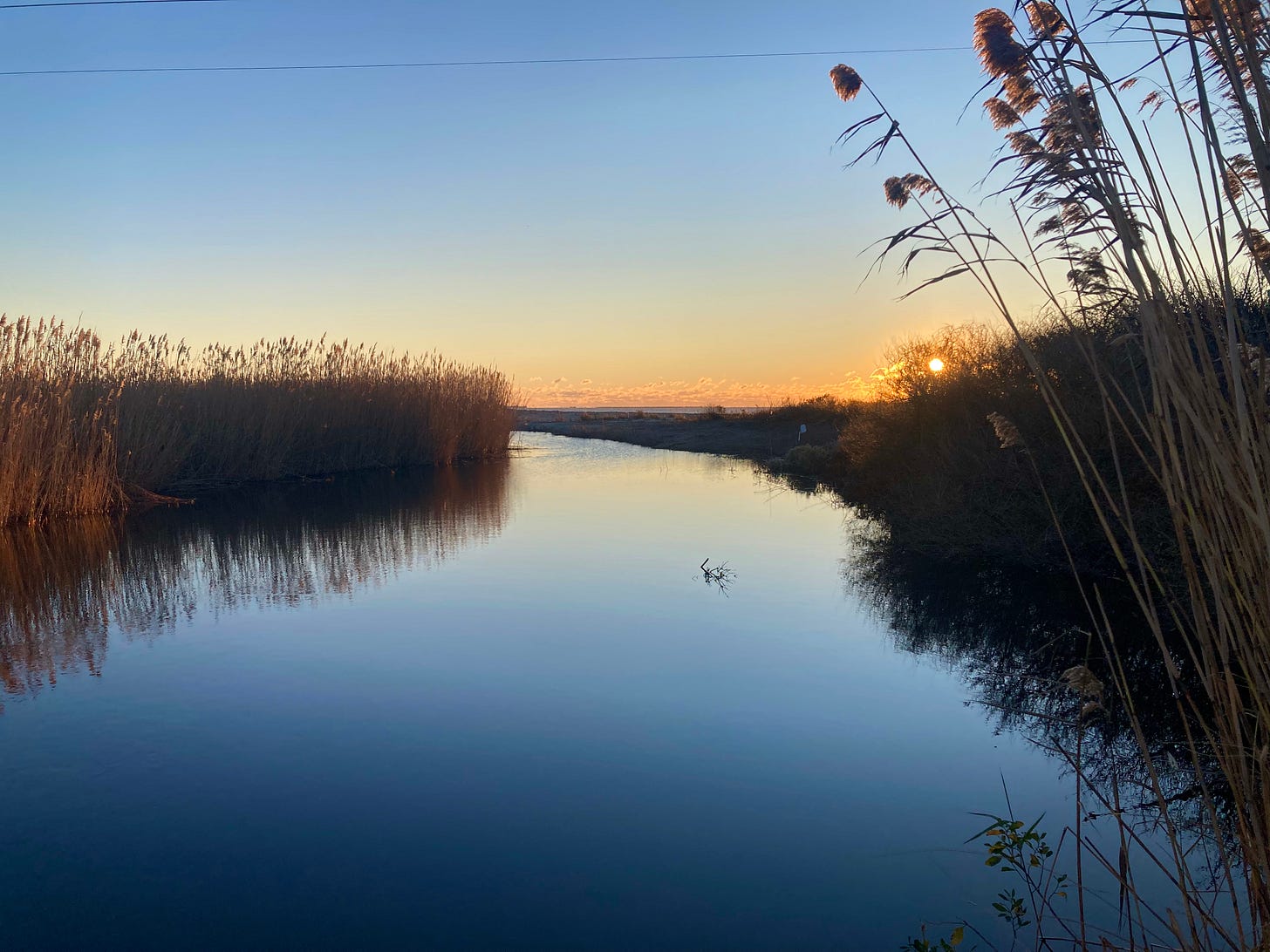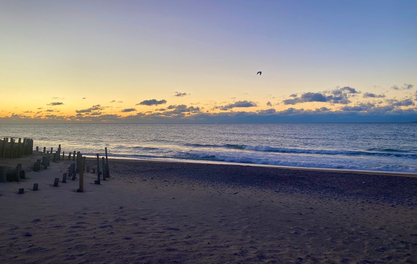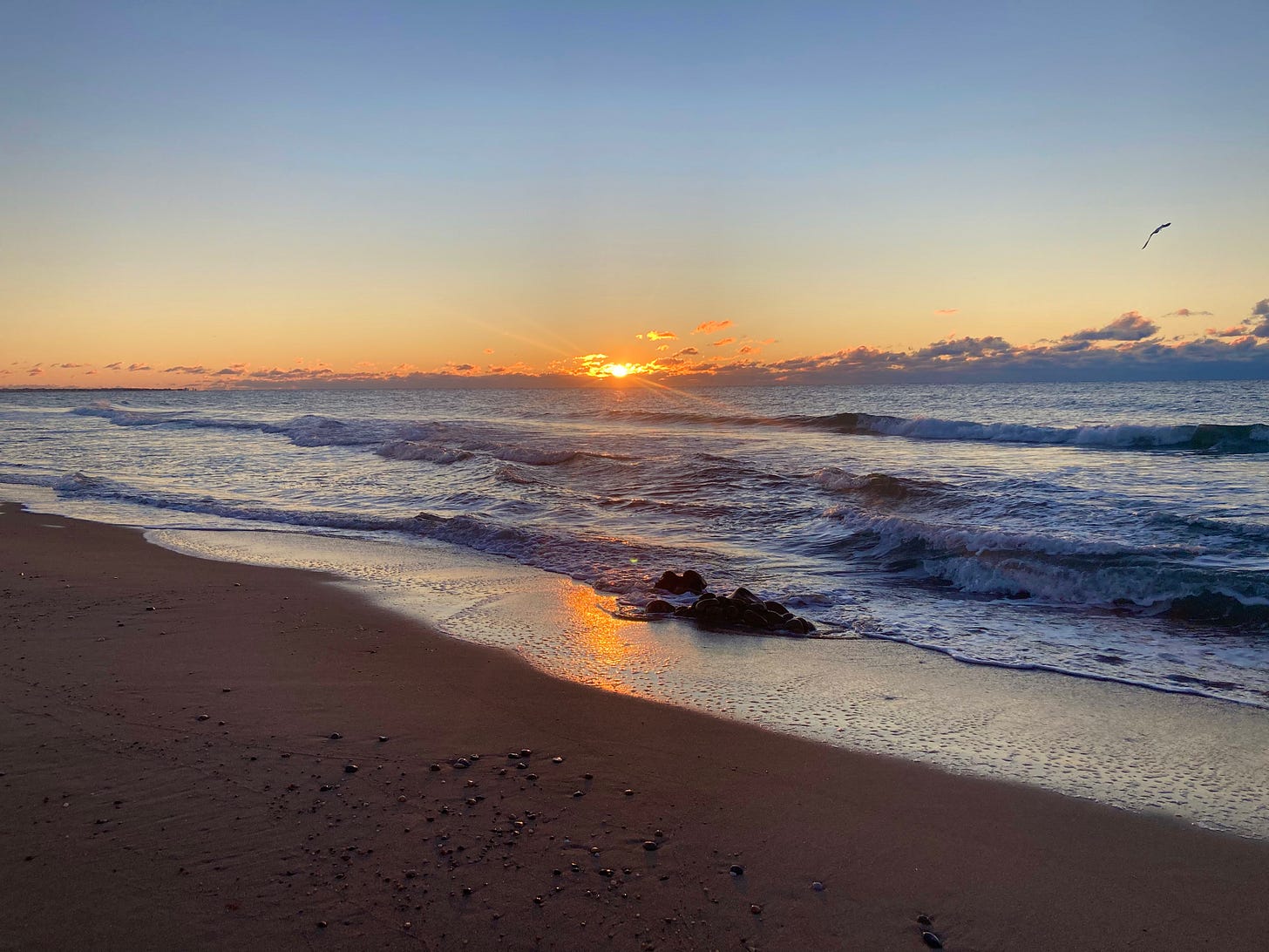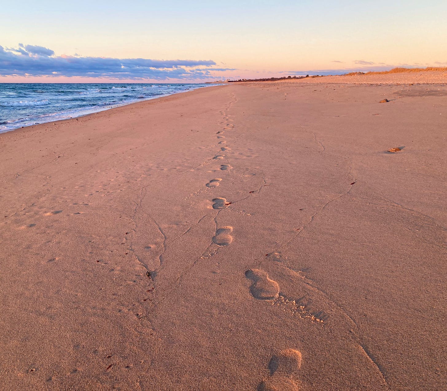 I’ve often wondered why some of us love to ruminate, to reflect and discern while walking along beaches, especially in the softer shoulder hues of the day, and during seasons other than summer. It comes as no surprise that on this perfect November beach at dawn, I’m the only one here save for birds. The entire length of the beach. Just me. The very edge of the abyssal ocean extends out to forever on one side of me, a swath of timeless moonstones to the other, and countless grains of packed sand pressing under each step. A planetary event unfolds before me, and the light it makes is warm and good. It’s easy to know my place here. It’s easy to feel a bit vulnerable.
